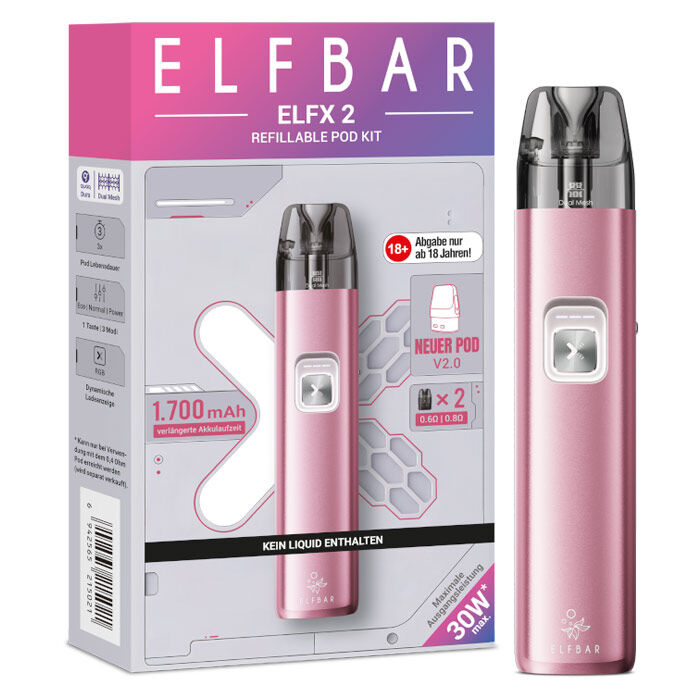 Mit dem ELFBAR Elfx 2 E-Zigaretten Set erleben Sie die nächste Evolutionsstufe der Elfx-Serie. Ausgestattet mit einem beeindruckenden 1700 mAh Akku und einer gesteigerten Ausgangsleistung von bis zu 45 Watt, bietet dieses System Reserven, die weit über herkömmliche Pod-Systeme hinausgehen. Das robuste Gehäuse aus einer Zink-Aluminium-Legierung beherbergt ein intelligentes Display, das Sie über alle relevanten Parameter informiert. Dank der präzisen Airflow-Control und der innovativen QUAQ-Mesh-Technologie ist die Elfx 2 sowohl für restriktives DL als auch für klassisches MTL-Dampfen perfekt geeignet.